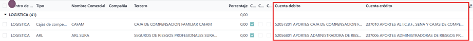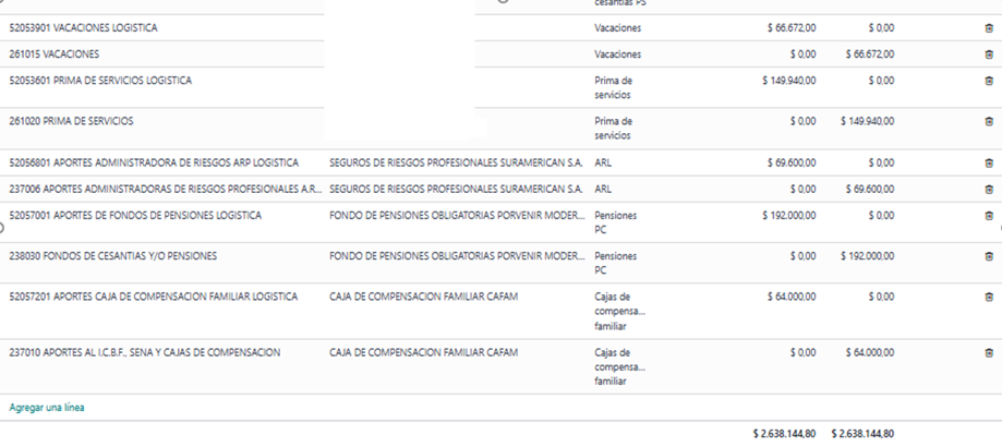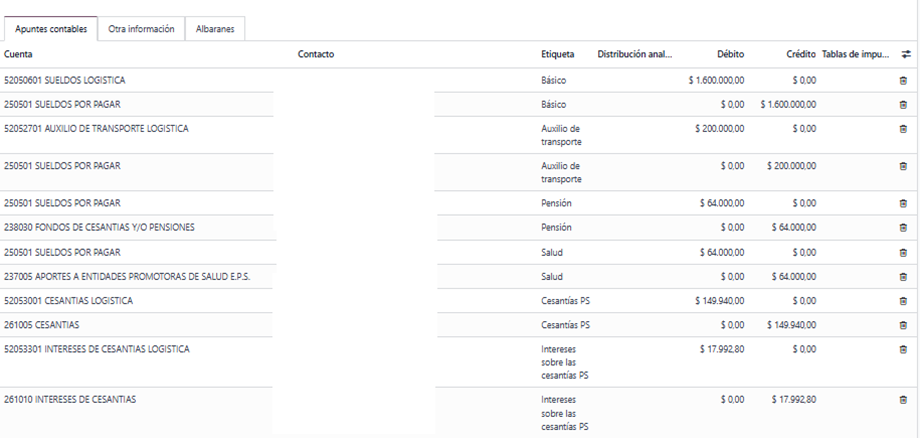 La configuración debe realizarse en todos los conceptos salariales, cada concepto debe tener cuenta debito y crédito.