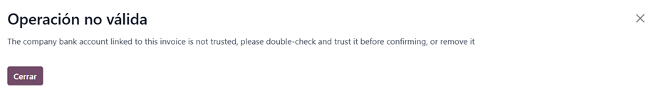 The company bank account linked to this invoice is not trusted, please double-check and trust it before confirming, or remove it