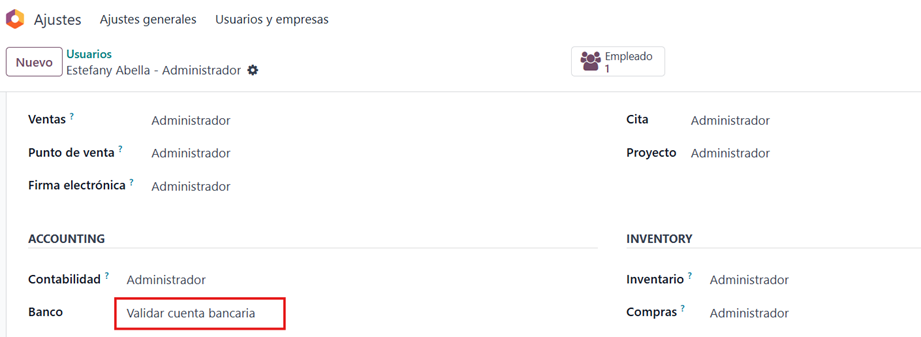 Seleccionamos el usuario que le vamos a otorgar los permisos de banco y activamos esta opción.