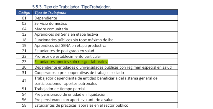 Adjunte o consulte la tabla oficial de Tipos de Trabajador utilizada por la DIAN para validar este campo.