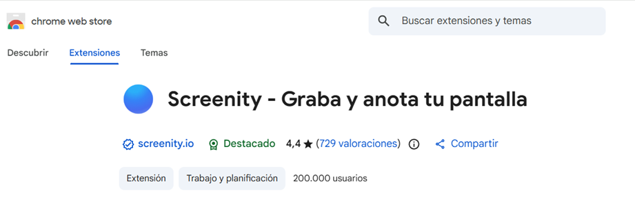 2. Vayan al Chrome Web Store y busquen: Screenity https://chromewebstore.google.com/detail/screenity-screen-recorder/kbbdabhdfibnancpjfhlkhafgdilcnji?hl=es