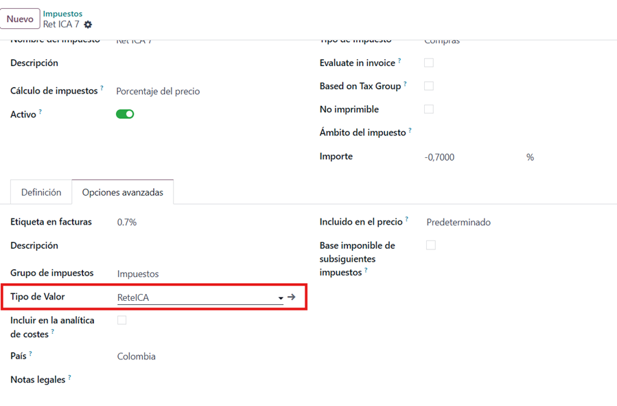 MODULO CONTABILIDAD à CONFIGURACIÓN à IMPUESTOS à INGRESAMOS AL IMPUESTO A EDITAR à OPCIONES AVANZADAS.