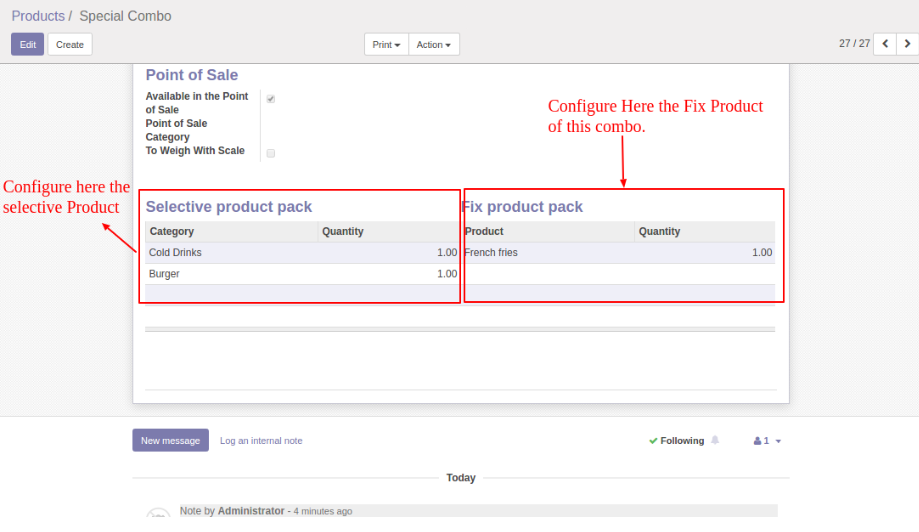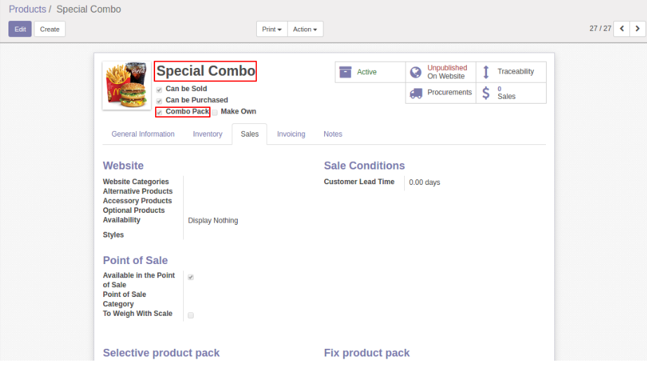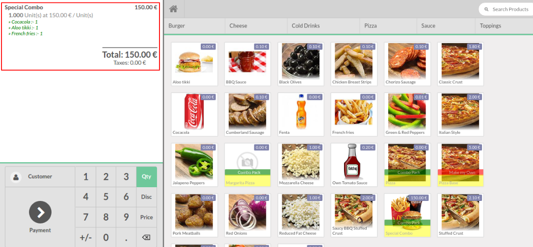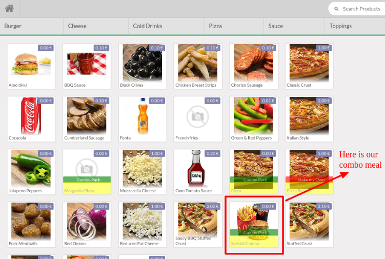 - Cree un producto Combo Pack. Este producto se comporta como un producto combinado en la pantalla POS como se indica a continuación.