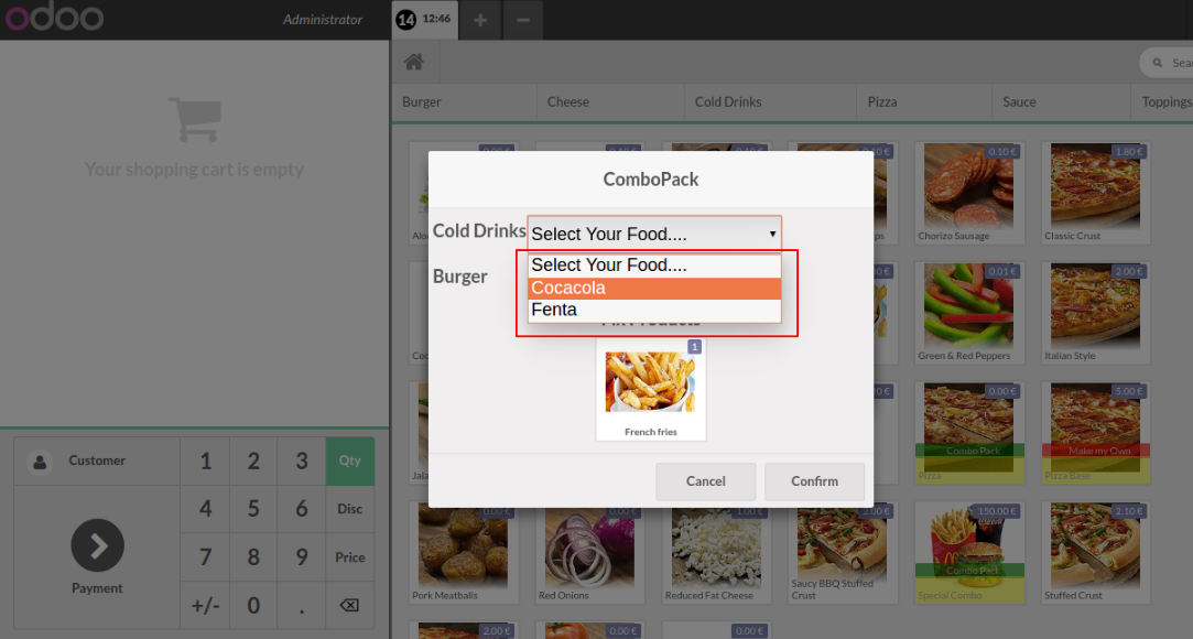 - Puede ver que el menú desplegable tiene 2 productos en la categorÃa de bebidas frÃas, como coca cola y fenta.
