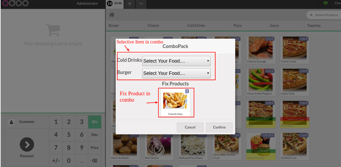 - Aquà tenemos que configurar los productos selectivos y también configurar el elemento fijo para este producto de comida combinado como se muestra en la imagen de arriba.
