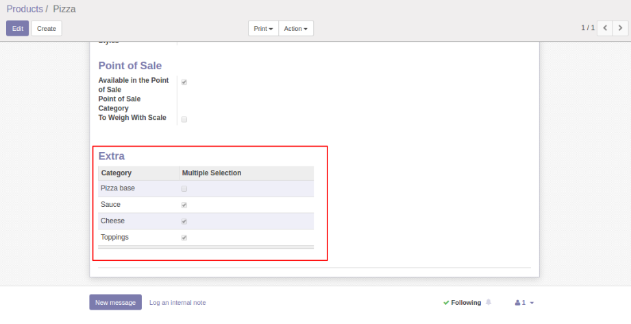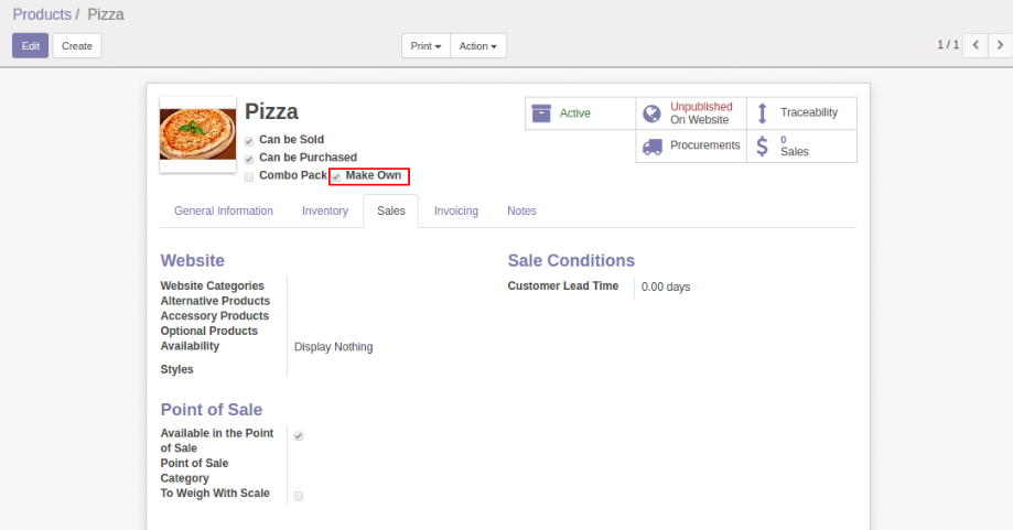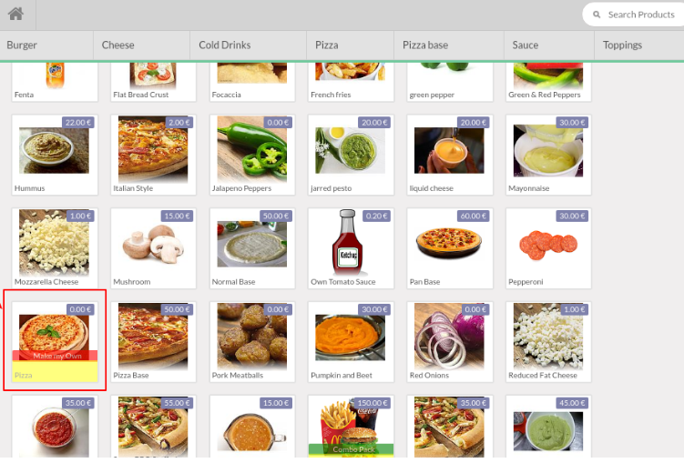 - Haga un producto cuyo nombre sea pizza en el producto POS como se muestra a continuación.