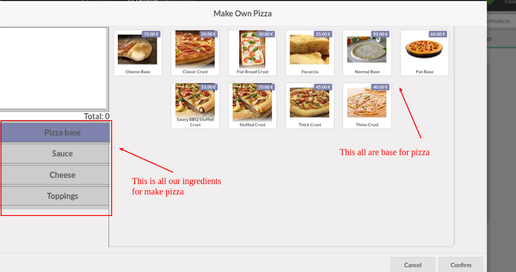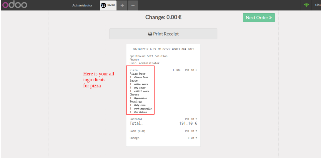 - Después de toda la selección, la pantalla pos proporciona todos los detalles de los ingredientes y la cantidad total de pizza.