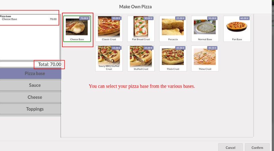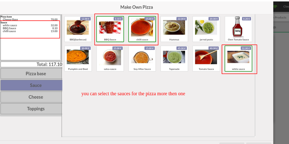 - Como puede ver en la pantalla de arriba, haga clic en la base de queso y los ingredientes se agregarán automáticamente a su factura.