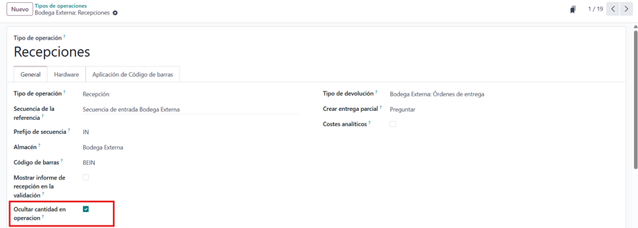 Dentro del menú Productos → Configuración → Operaciones, el módulo incorpora un checkbox en cada tipo de operación. Este control determina el comportamiento de visualización de cantidades en la aplicación de Barcode.