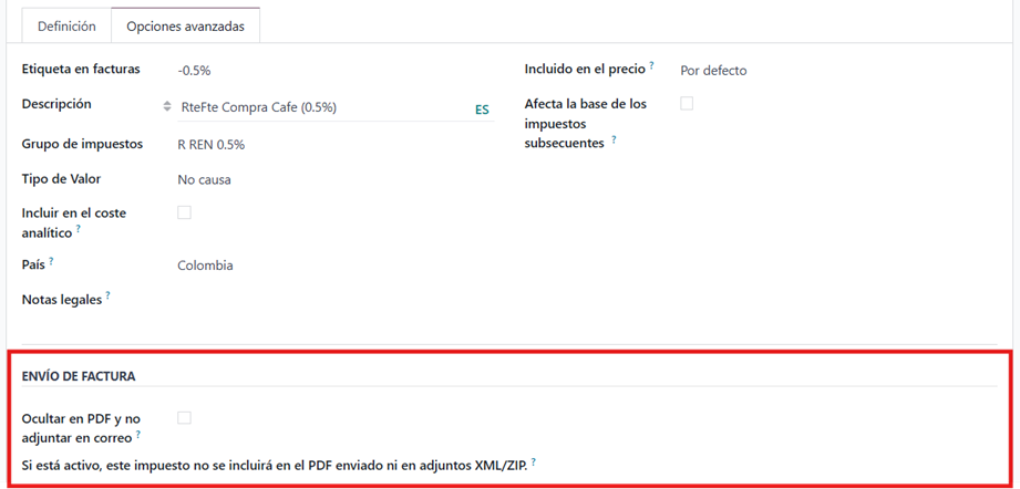 Dentro de la configuración de Impuestos, el módulo añade o ajusta una pestaña denominada “Envío Factura”, desde la cual se controla el comportamiento del impuesto en los procesos de transmisión electrónica.